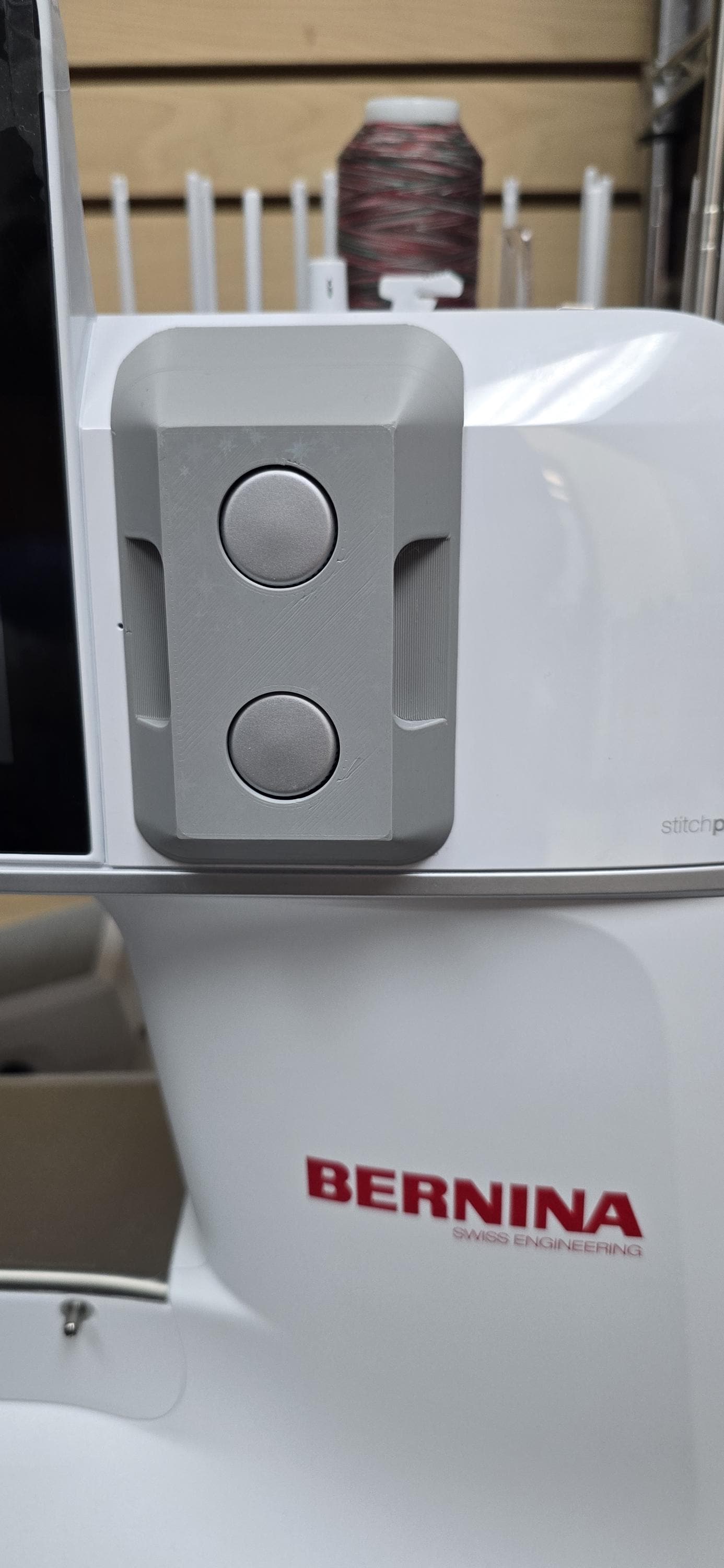 These guards provide peace-of-mind when transporting your Bernina 990 machine by helping to ensure that the knobs and bobbin winder don't get bumped and broken. The knob guard is custom designed to protect the two front multifunction knobs on the Bernina 990 (sewing machine not included). The knobs on the 990 are very different than the knobs on other Bernina machines, but this guard is designed to provide a satisfying click when pushed onto the knobs. It may be a little tight the first few times you remove it, but you can press on the knobs as you pull it off. After a few times, it should loosen up a bit to make it easier to remove.