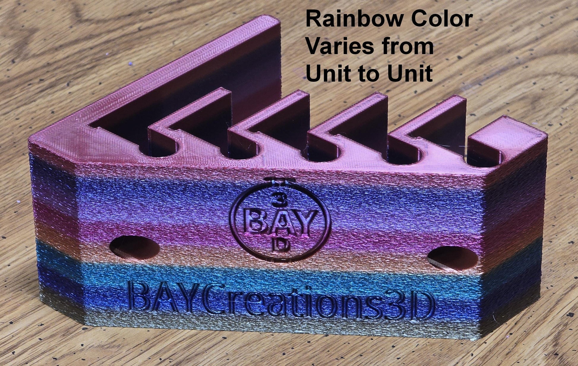 This storage rack is available in 24 solid covers and with a Rainbow coloration (+$10). The available colors are shown using Knob and Bobbin Winder protectors as examples, but are NOT included with this products, although they are available for purchase in other listings in my Etsy Shop. Note that different Rainbow units may have different colors and which may be in different colors with different width bands as the multicolored filament used has many variations, so it is unlikely that two units will be identical.