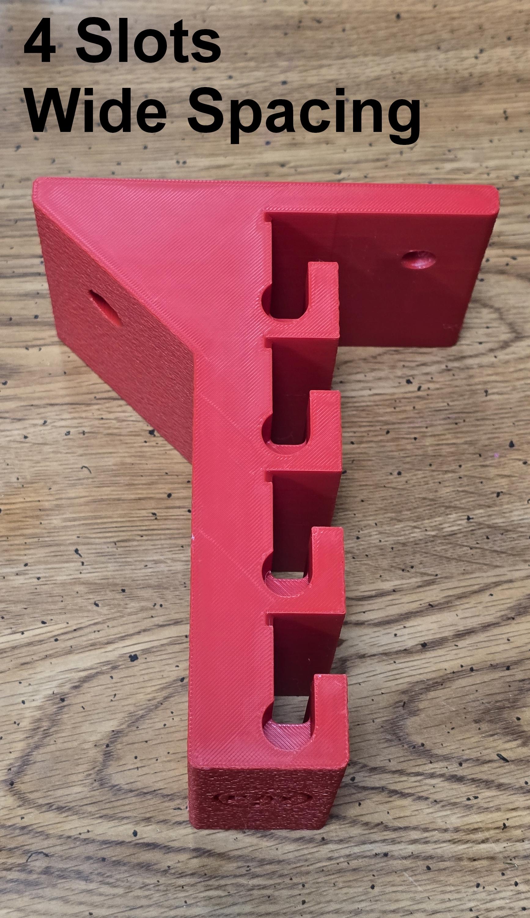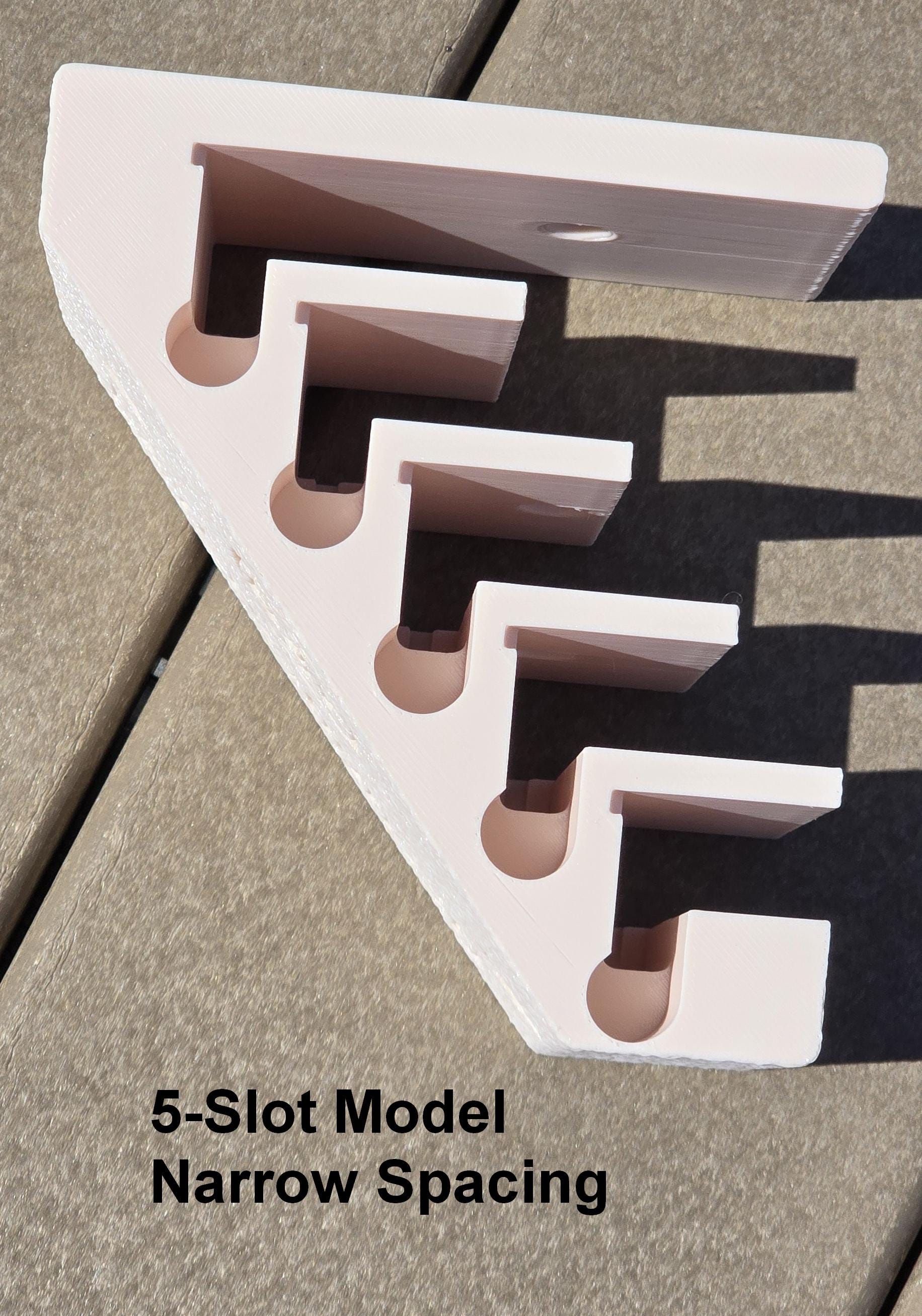 There are two models. The Full-Width Spacing model has 4 slots with 1.5" spacing to allow the large ratcheting knob on the Giant, Jumbo, Maxi, and Midi Hoops to fit without interfering with an adjacent slot. It sticks out from the wall 6.38" and is 5" wide and 3" tall. The Narrow model staggers its 5 slots so it can hold 5 hoops but if you have multiple hoops with the large ratcheting knob, the knobs may interfere with their neighboring hoops. It sticks out from the wall 5" and is 4.5" wide and 2.5" tall.