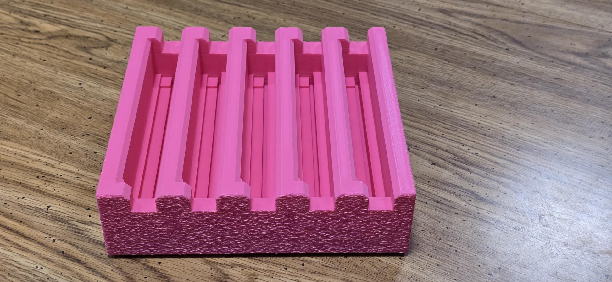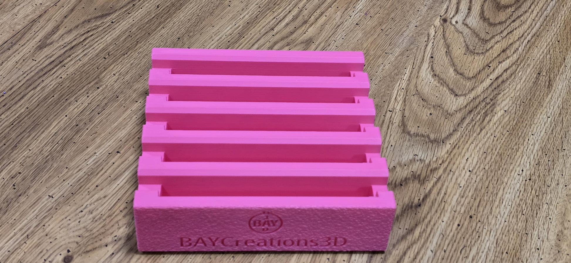 This tabletop storage rack holds 5 slide-in style Brother or Baby Lock Embroidery Hoops and is 6" wide,d 5.5" deep, and a bit less than 1.25" tall when empty. It is compatible with embroidery hoops for a wide range of Brother and Baby Lock machines including Brother Innovis models and Baby Lock Destiny, Aventura, Aerial, Esante, Ellageo Plus, Ellegante, Ellisimo, Flourish, Flare, Journey, Meridian, Pathfinder, Solaris, Spirit, Unity, and Vesta. If your hoop slides into your embroidery module from the front, not from the top, then your hoops will probably fit. If you have one of the other two Brother-BabyLock attachment mechanisms, let me know if you are interested in a tabletop storage solution as I will consider making products for them if there is enough interest.